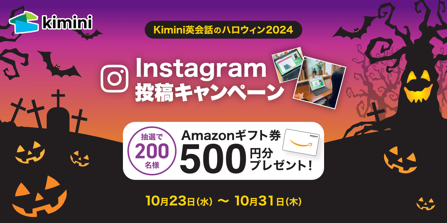 ✨🎃ハロウィンも英語学習も楽しむ!抽選で200名様にアマゾンギフト券が当たるInstagram投稿キャンペーン開催👻🦇✨ 作成日時 2024年10月21日 06:34 いつもKimini英会話をご利用いただき、誠にありがとうございます。 まもなくハロウィンということで、抽選で200名様に500円分のAmazonギフトカードが当たるInstagram投稿キャンペーンを開催いたします! 一緒にハロウィンも英語学習も楽しみましょう! 20241023_halloween (1).jpg 200 KB Download 関連記事 🎉【結果発表】第1回Kimini英会話スピーチ動画コンテスト🎊 11/17(日) システムメンテナンスに伴う休講のお知らせ Kiminiユーザーガイド iPadでワイヤレスイヤホン使用時に発生する音声トラブルについて 家族や兄弟と一緒の受講