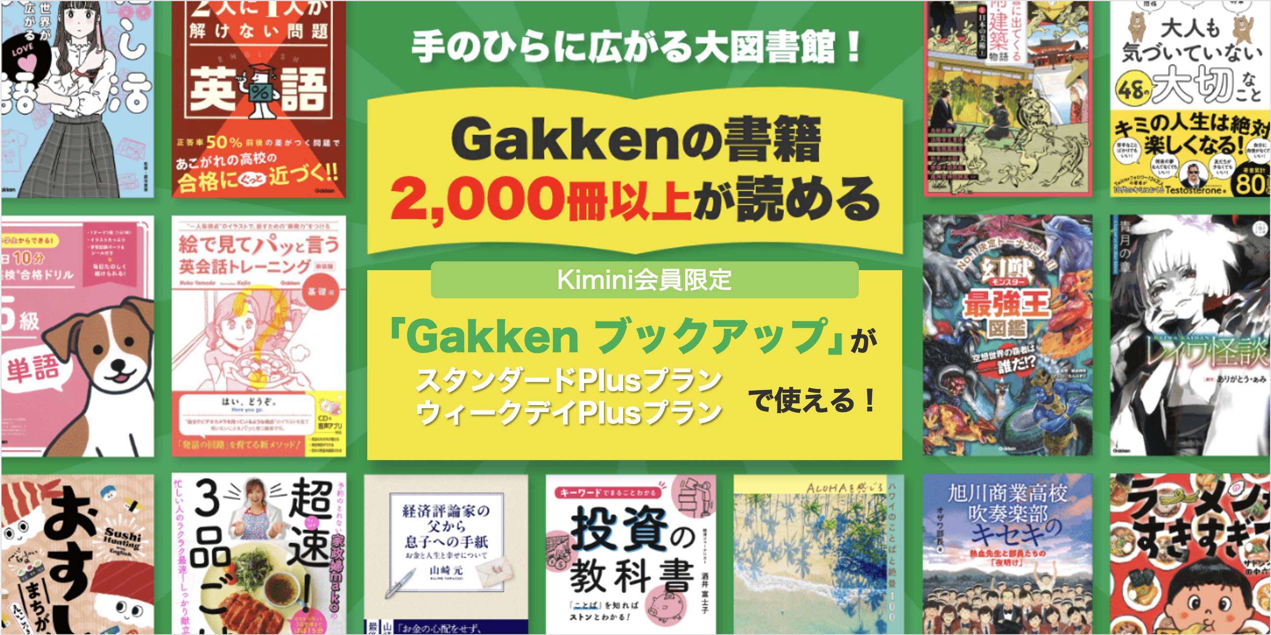 このたび、Kimini英会話の人気プラン「スタンダードPlusプラン」「ウィークデイPlusプラン」がさらにパワーアップし、該当プランの有料会員様限定で、学研グループの電子書籍読み放題サービス「Gakkenブックアップ」が追加費用なしでご利用いただけるようになりました。