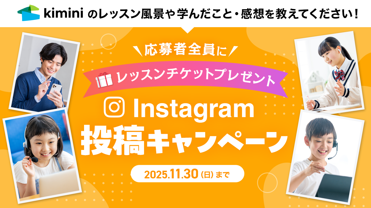いつもKimini英会話をご利用いただき、誠にありがとうございます。本日はレッスン風景をインスタグラムに投稿するともれなくレッスンチケットがもらえるお得なキャンペーンのご案内です。無料体験期間中でもご参加いただけますのでお気軽にご参加ください。