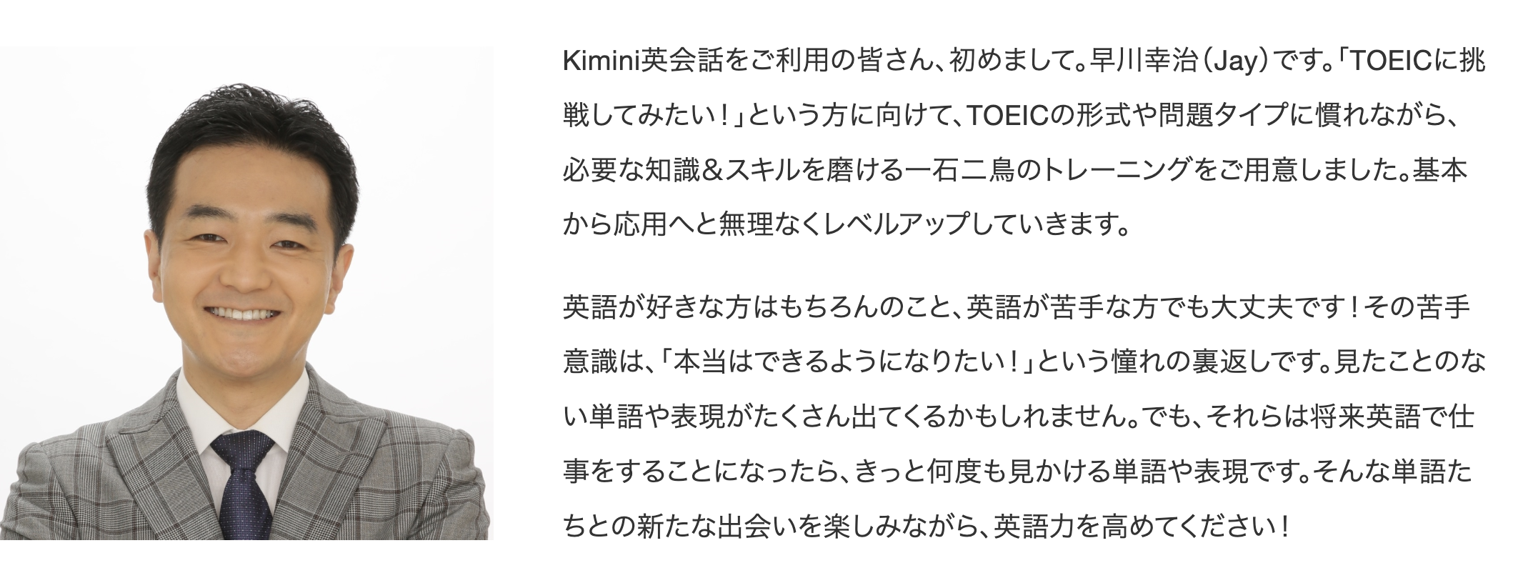 監修は、TOEIC®満点(990点)・英検1級・著書60冊以上の実績を誇る英語講師 早川幸治(Jay)先生。そんなJay先生は実は「高校2年生で英検4級に不合格」という、かつては大の英語嫌いだった経験もあったとか。だからこそ、英語に苦手意識を持つ方やTOEIC®初心者の方でも迷わず学習を進められるよう、効果的で続けやすいカリキュラムを監修することができました。