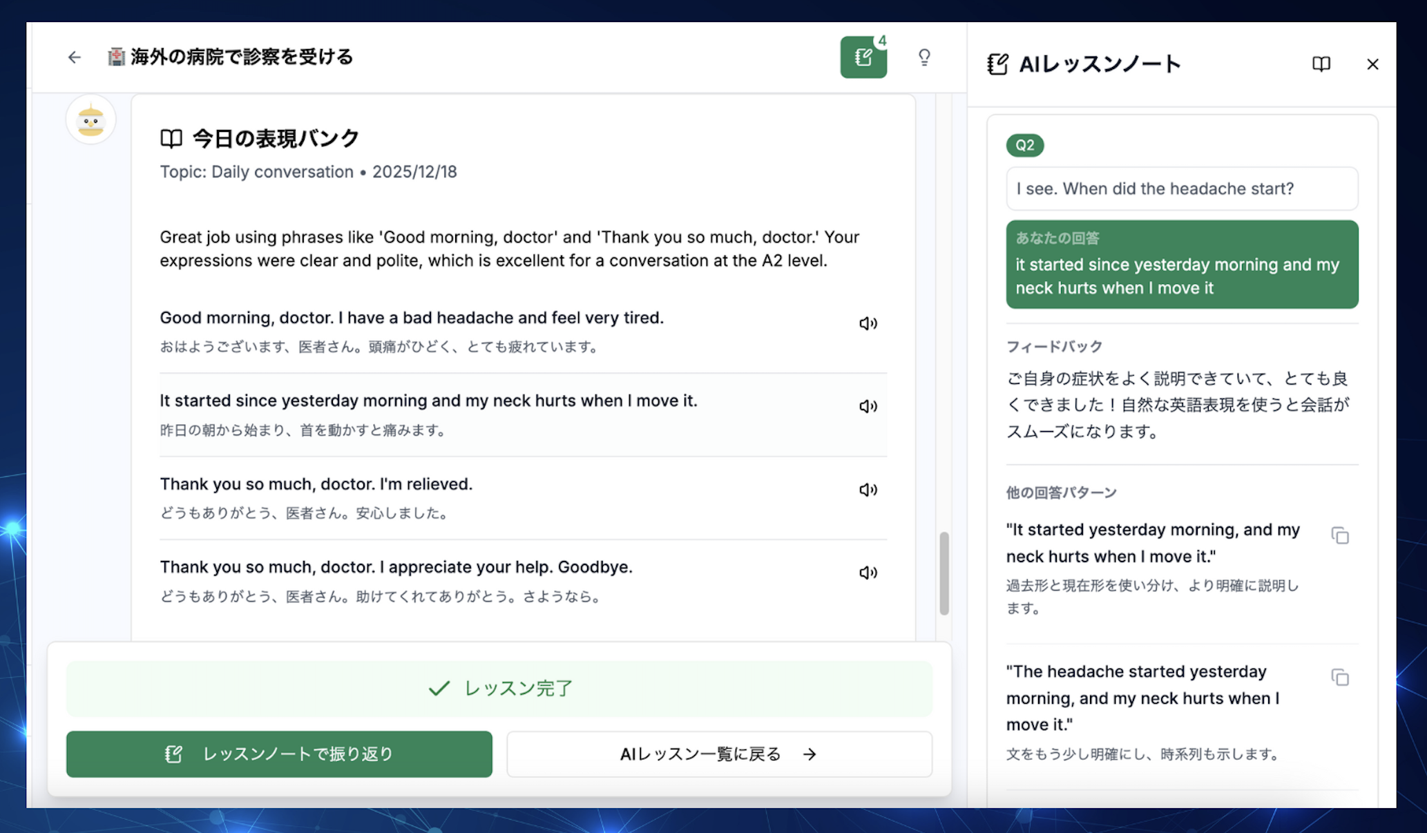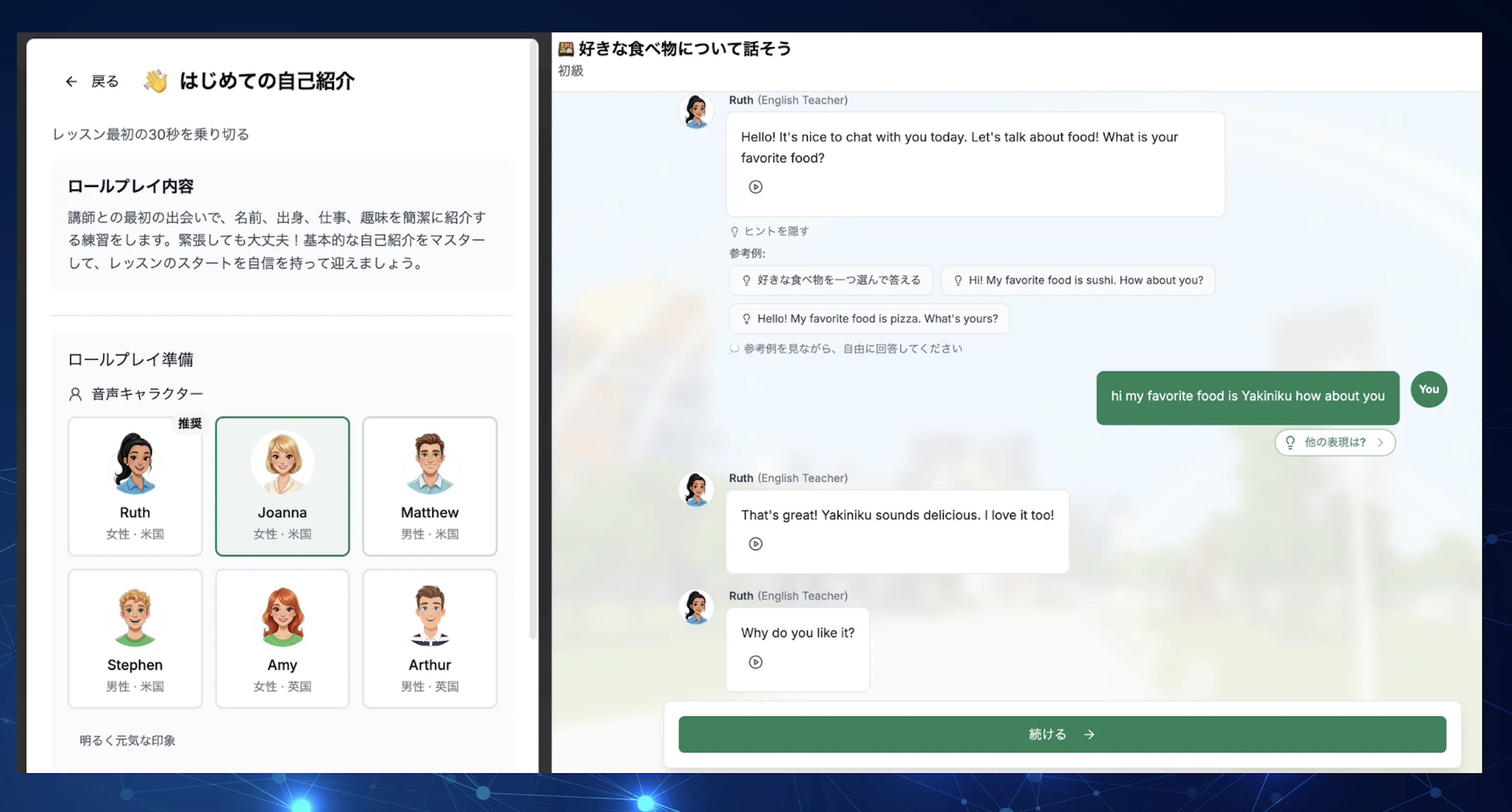 「自己紹介」「旅行」「ビジネス」など、目的に合わせたシチュエーションを選んでロールプレイ。AIが相手だから、間違いを気にせず、納得できるまで何度でも繰り返し練習できます。