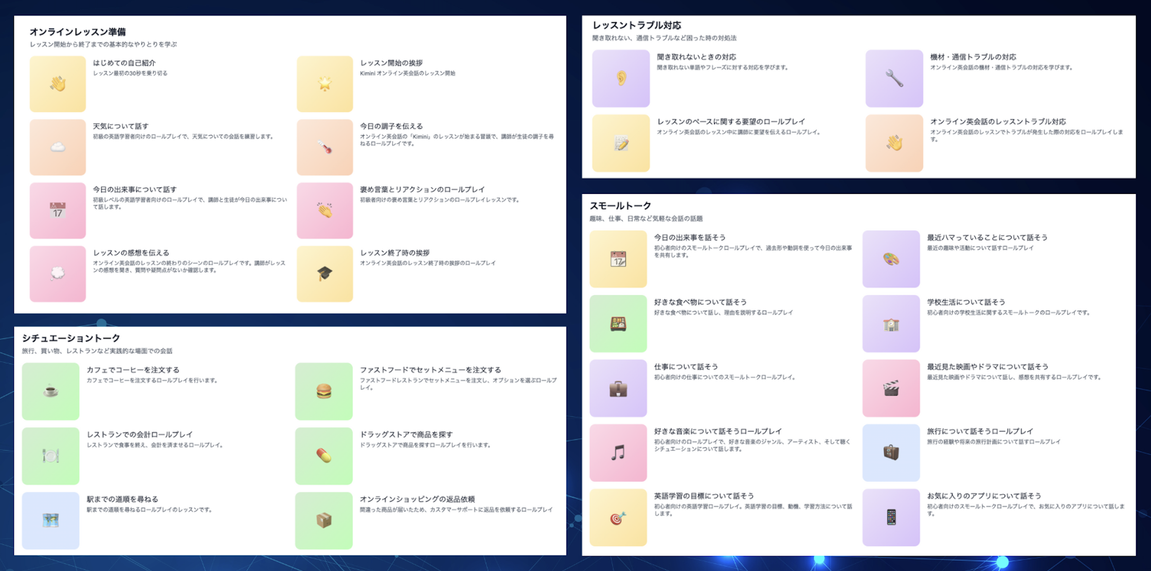 「人と話すのはまだ緊張する…」「レッスン以外でも話す量を増やしたい」そんな方の“話す練習の場”としてぴったりの機能です。