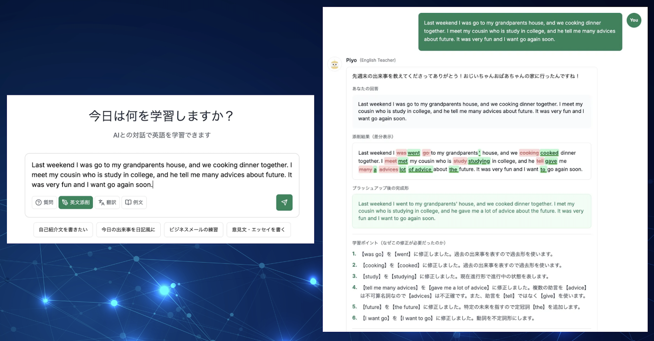 質問も雑談も自由に楽しめるAIチャット。あなたの英語をその場で添削し、自然な言い回しやポイントをわかりやすく解説します。わからない単語や表現は日本語で確認できるので、英語に自信がない方でも会話を止めずに安心して続けられます。