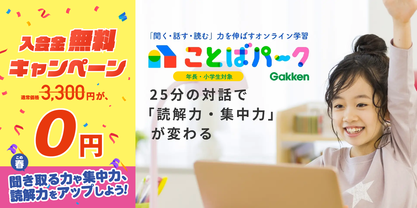 本日は学研が提供する年長・小学生向けのオンライン国語学習サービス「ことばパーク」の入会金が無料になるコラボクーポンのご紹介です。ことばパークは「聞く・話す・読む」の力をバランスよく育てることを重視し、学習の基礎となる集中力や記憶力を自然に伸ばすオンラインサービスです。オンラインでのやりとりを通じて「話す力」が自然に鍛えられ、自分の考えを的確に伝えるスキルが身につきます。また、「聞く力」「読む力」も着実に伸ばすことができ、将来的なコミュニケーション能力や思考力の基礎づくりにもつながります。