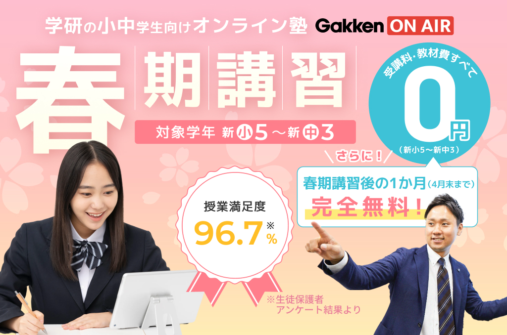 本日は、学研グループのオンライン学習塾「学研オンエア」より、春期講習のご案内をいたします。短い春休みを有意義に過ごせる春期講習に、完全無料でご参加いただけます。春休みの総復習で、新学年最高のスタートダッシュを決めましょう!さらに、学研グループサービスからお申込みの方限定で「究極の勉強法」動画プレゼント!講師歴25年の塾長山下が「勉強する際に本当に大切なこと」を直接解説します。