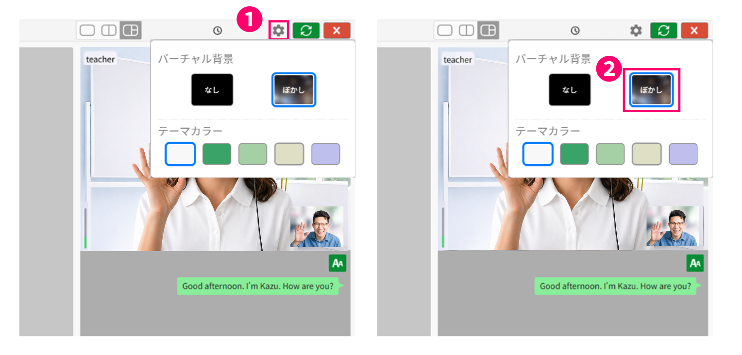 ※背景ぼかし機能をご利用時、手に持った物がぼやけてしまう場合があります。講師に物を見せる際は、お体の前に持って映していただくことをおすすめします。