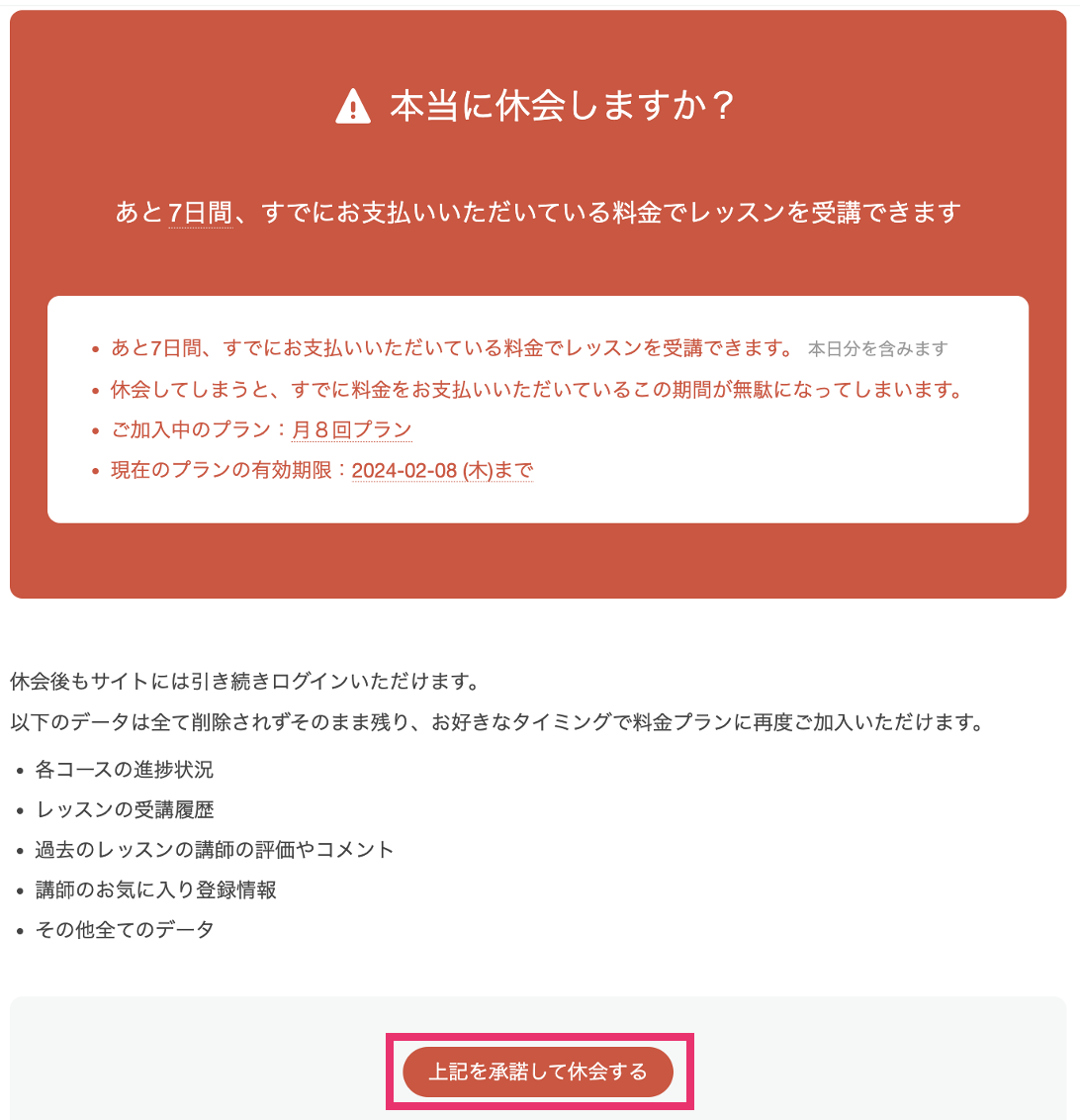 - アカウントやご受講履歴は残したまま、料金プランを解約できます。 休会のお手続き後は、ご利用中の料金プランは即時無効となります。